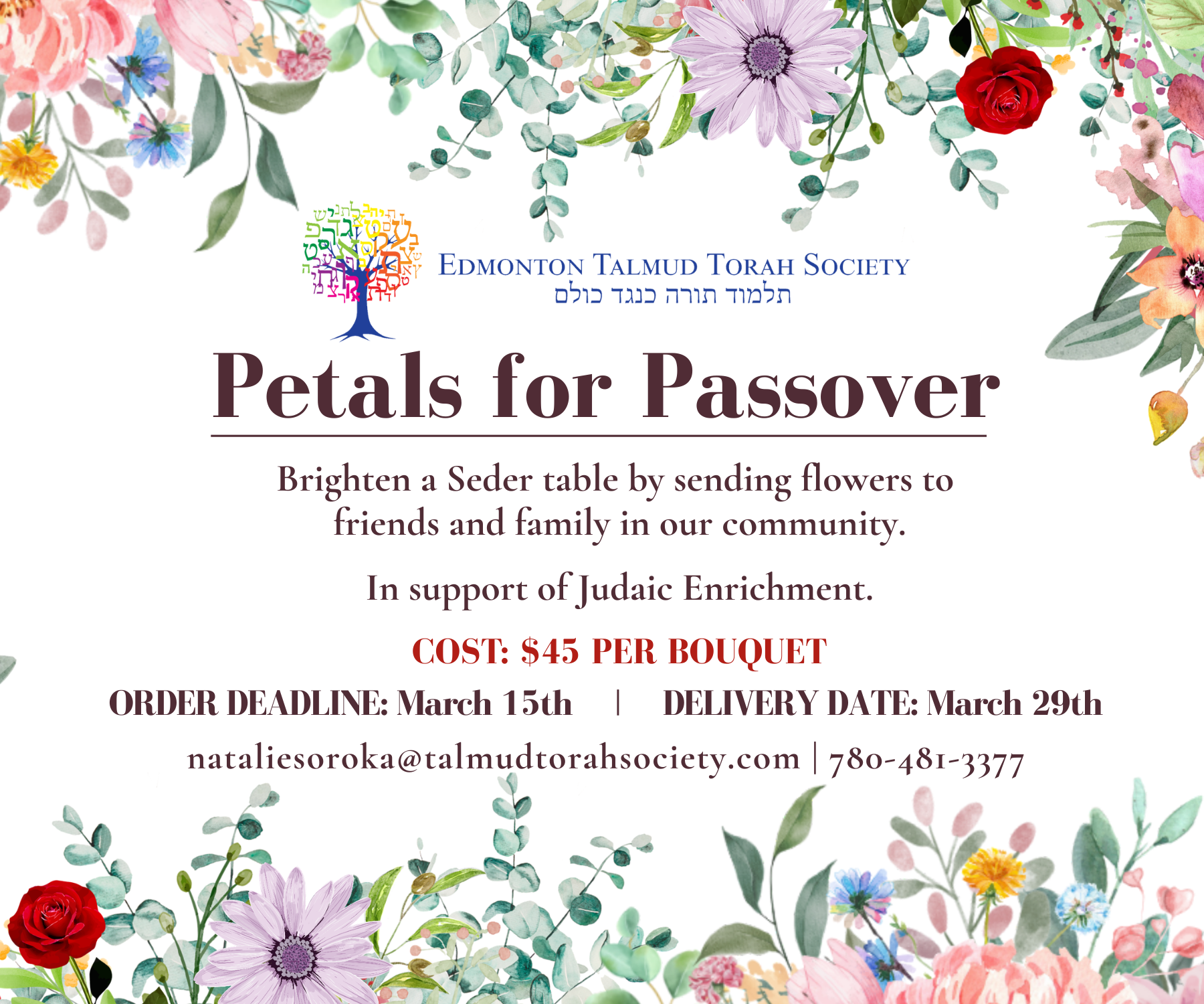 Brighten a Seder table by sending flowers to friends and family in the Edmonton area.